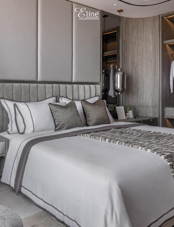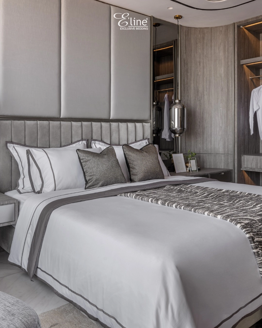 Want that five-star hotel vibe at home? Combine crisp white bedding with layered gray tones.